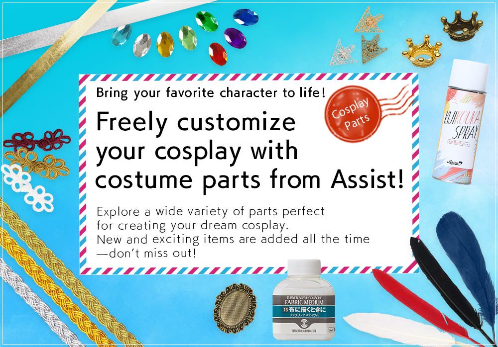 Express your cosplay costumes as you like with Assist's cloting parts!We offer more than 500 kinds of parts that can be used to make cosplay costumes!