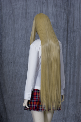It is about 110 cm long style. Bangs are also long and ideal for processing. Creamy and dull gold.