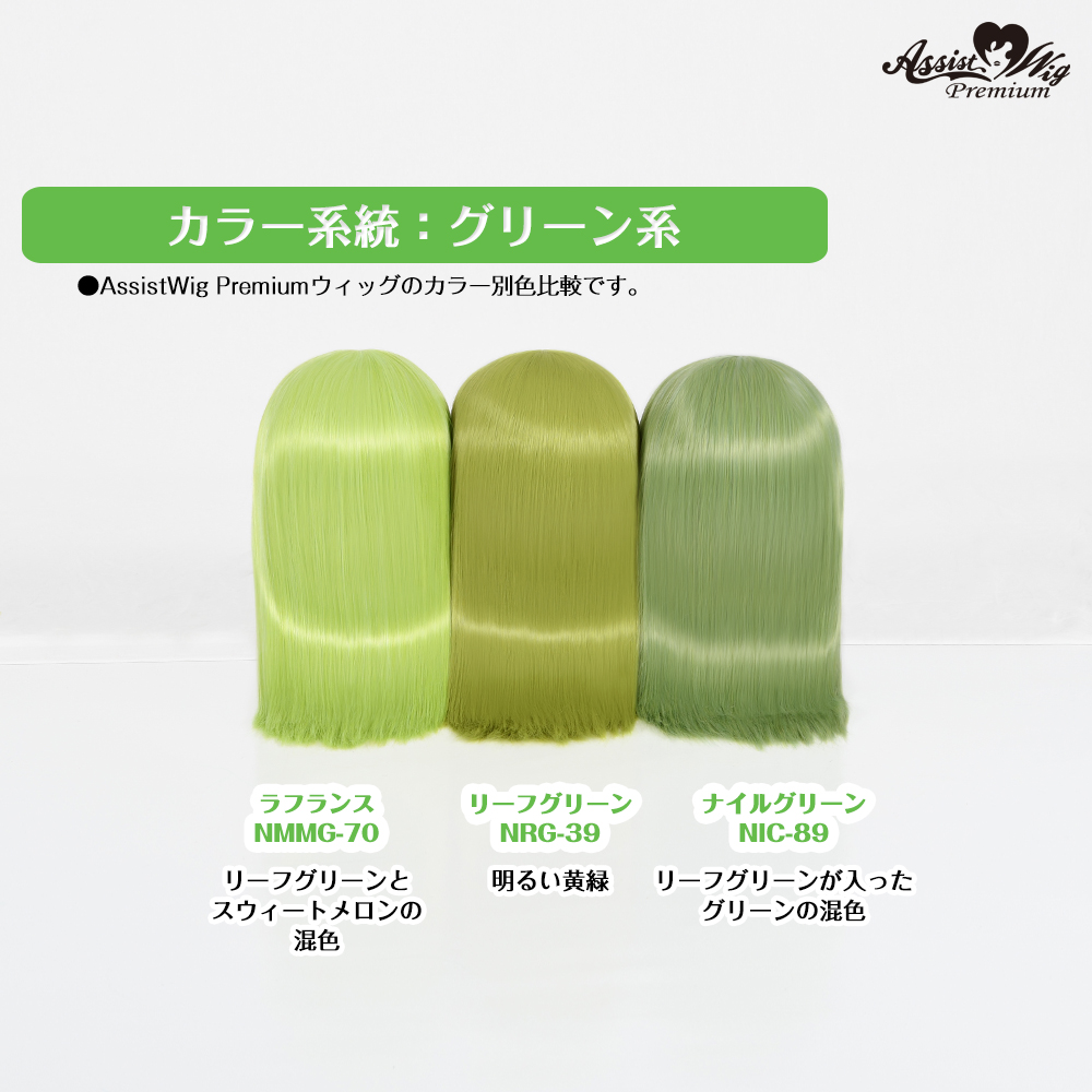 It is about 110 cm long style. Bangs are also long and ideal for processing. It is a mixed color of green with leaf green.