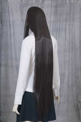 It is about 110 cm long style. Bangs are also long and ideal for processing. It is a mixture of black and bitter brown.