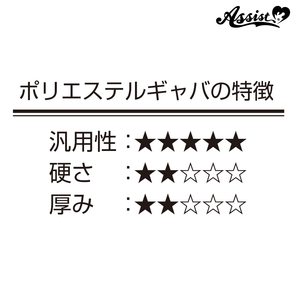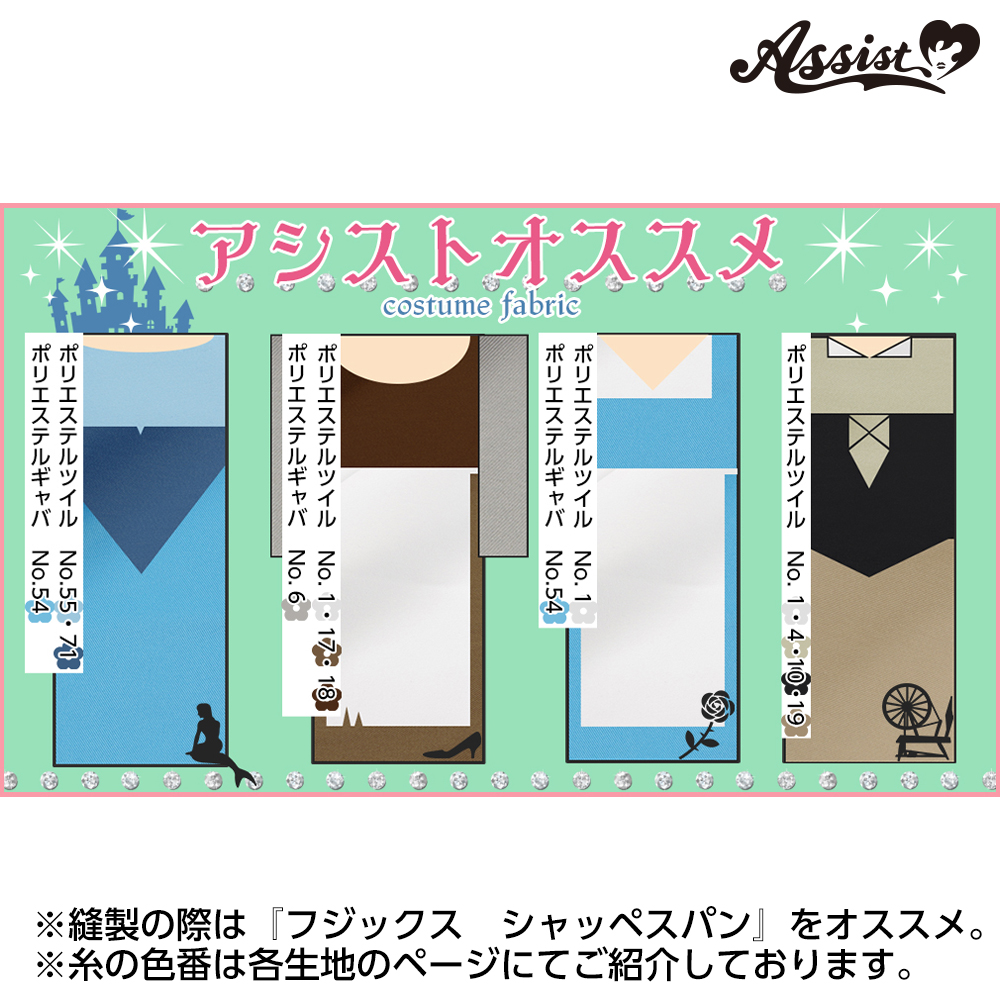 ●Standard fabric that can be used for a wide range of costume production ●Standard, firm fabric that is wrinkle-resistant ●Fabric with more shine than polyester twill ●Slightly thinner than polyester twill, easy to sew with a home sewing machine ●80 colors available